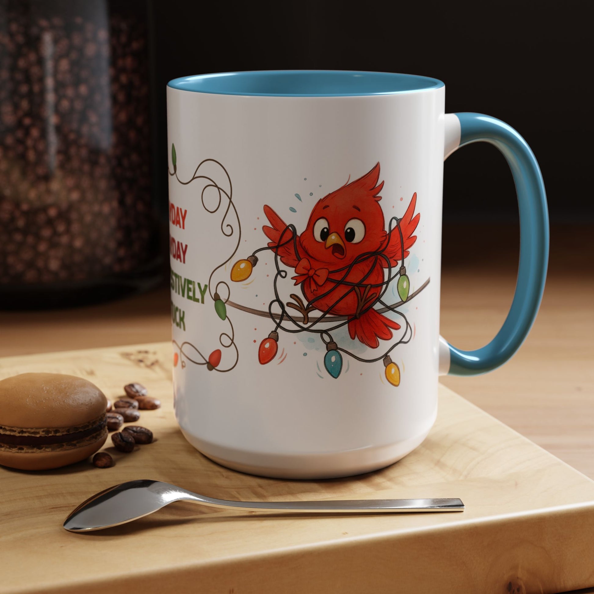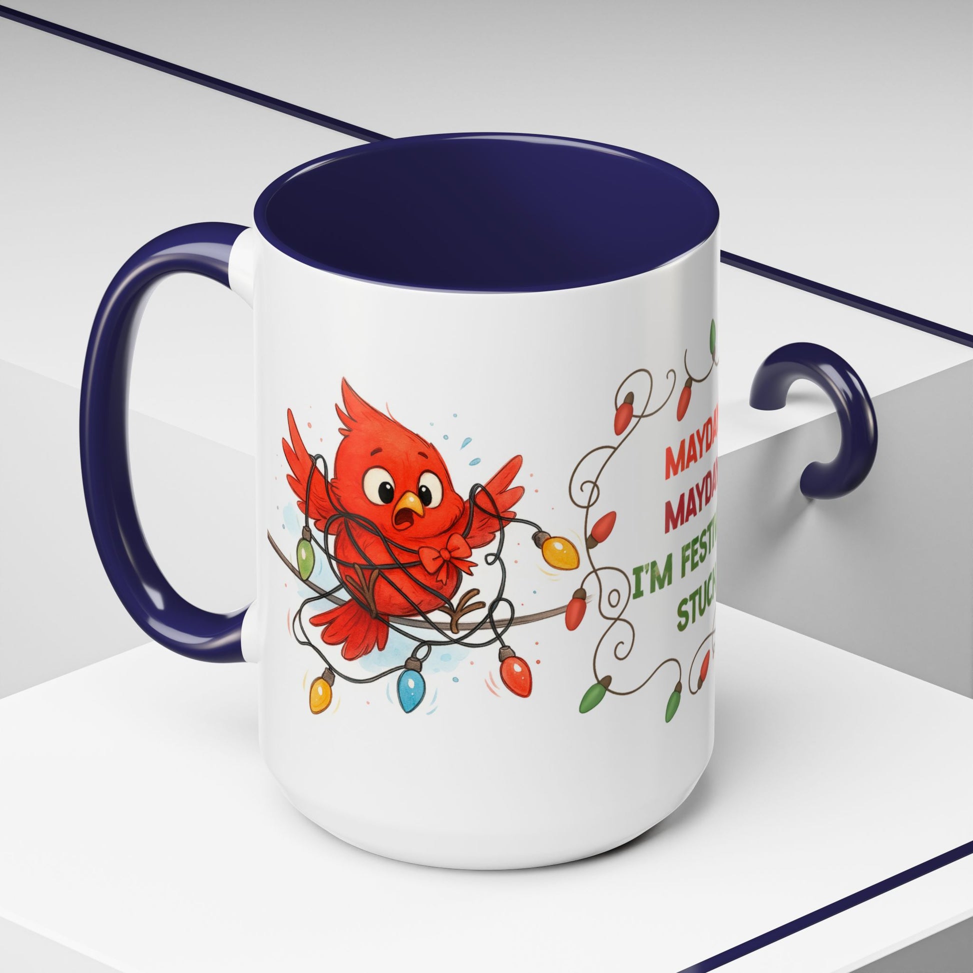Get tangled in laughter this season with our “Mayday Mayday I’m Festively Stuck” Christmas Mug! Featuring a panicked red cardinal wrapped in colorful holiday lights, this mug brings humor and cheer to every sip.