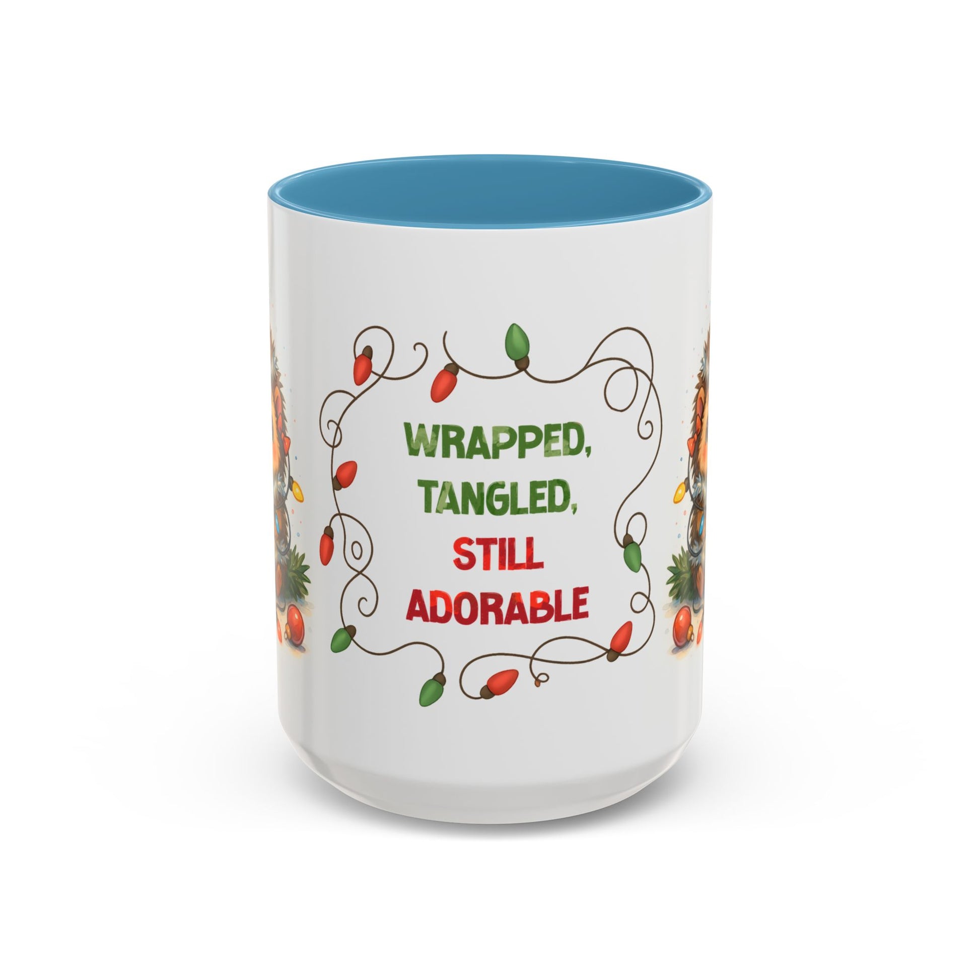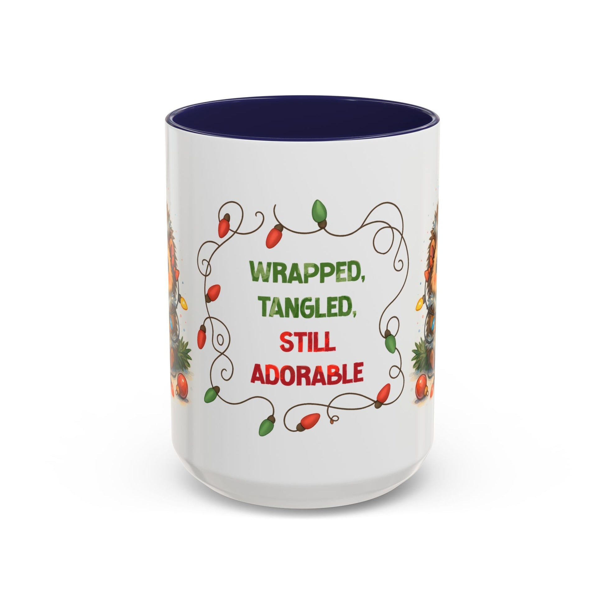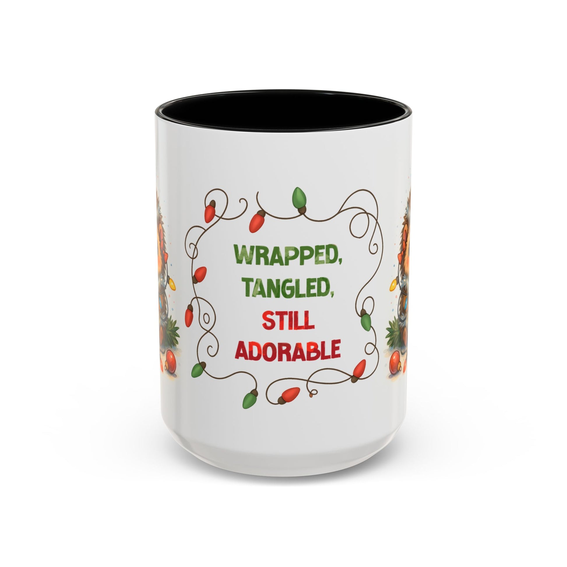 Sometimes the holidays get messy, and that’s what makes them adorable! Our “Wrapped, Tangled, Still Adorable” 15oz mug features a sweet hedgehog tangled in Christmas lights, reminding everyone that festive chaos can still be cute.